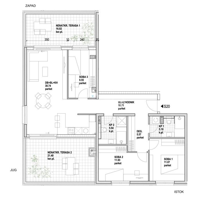 Stan se sastoji od dnevnog boravka s kuhinjom i blagovaonicom, 3 spavaće sobe, 2 kupaonice s wc-om, degažmana, ulaznog hodnika, 2 nenatkrivene terase i spremišta.