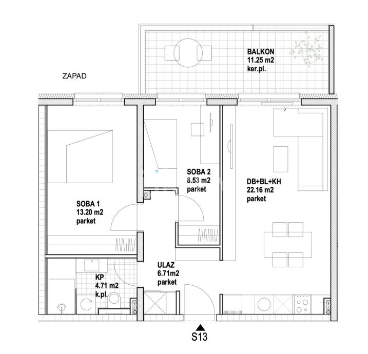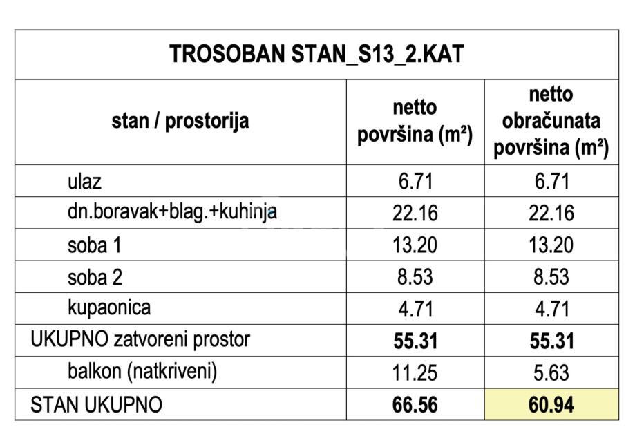 Prodaje se trosobni stan s13 površine 62,54 m2 na 2. katu zgrade s liftom.