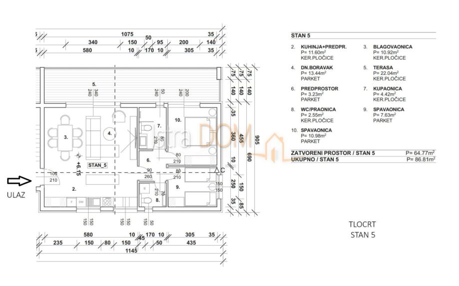 Stanu također pripada jedno vanjsko parkirno mjesto, terasa od 22 m2 te ostava od 7 m2.