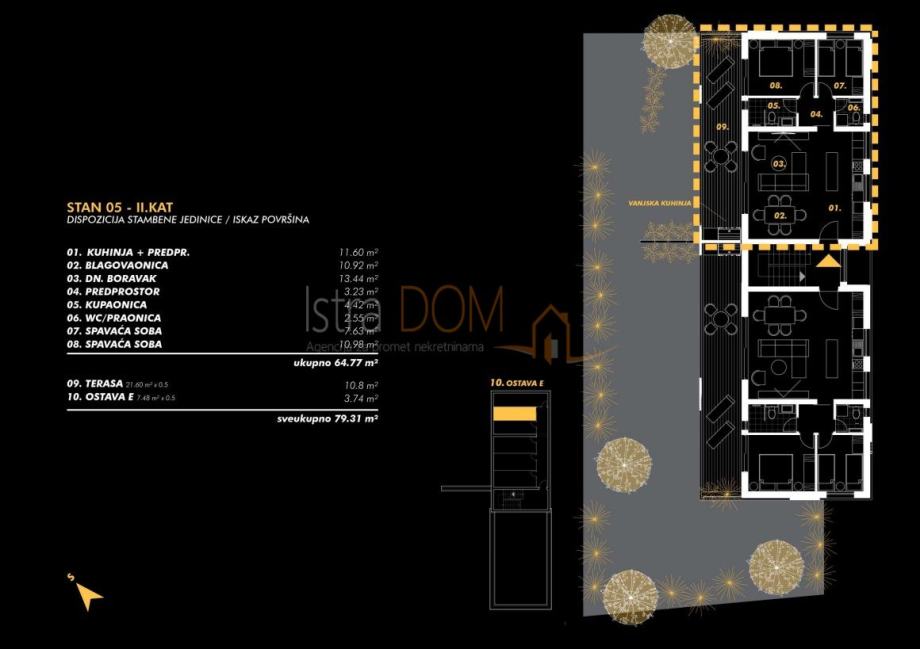 Prodaje se trosoban stan površine 79 m2 na drugom katu zgrade bez lifta koja se nalazi u mjestu Finida. Zgrada ukupno ima 2 kata te se sastoji od prizemlja, prvog kata i drugog kata. U zgradi će biti 6 stanova.