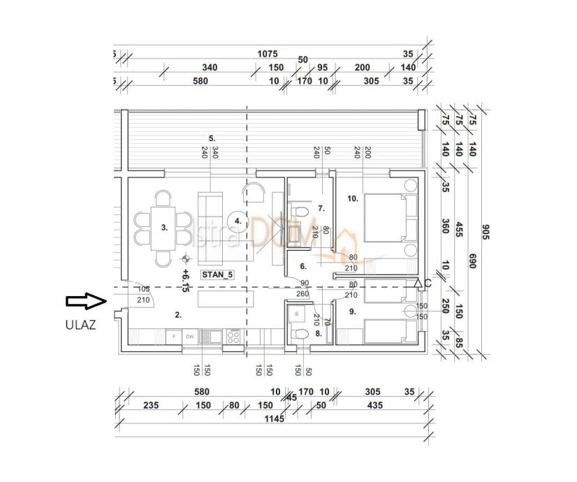 Stan se sastoji od zatvorenog dijela koji je površine 65 m2 te se sastoji od dnevnog boravka s kuhinjom i blagovaonicom, dvije spavaće, kupaonice s wc-om, wc-a te pretprostora.