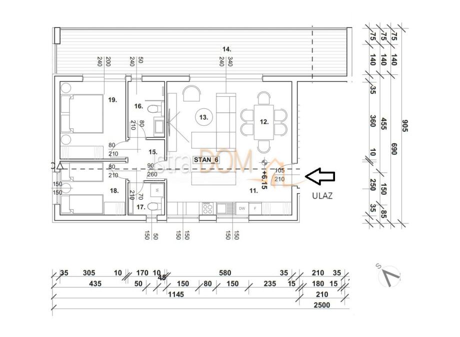 Stan se sastoji od zatvorenog dijela koji je površine 65 m2 te se sastoji od dnevnog boravka s kuhinjom i blagovaonicom, dvije spavaće, kupaonice s wc-om, wc-a te pretprostora.