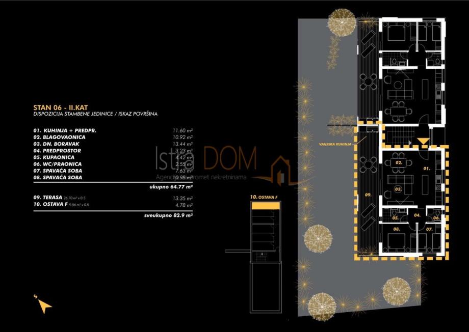 Stanu također pripada jedno vanjsko parkirno mjesto, terasa od 27 m2 te ostava od 10 m2.
