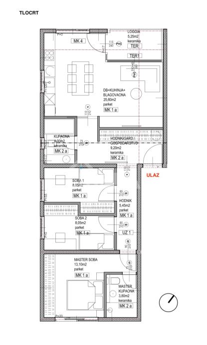 Prodaje se četverosobni stan neto obračunske površine 101,74 m2 na 1. katu novogradnje bez lifta.
