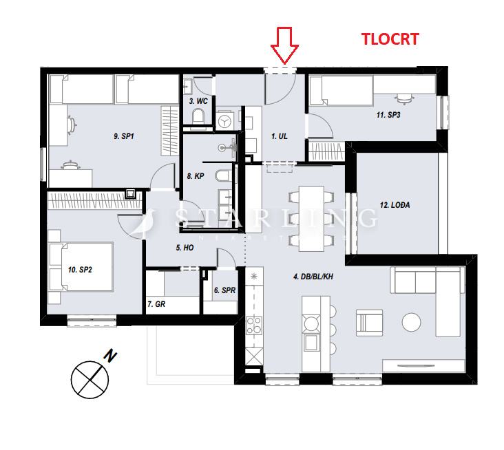 Stan se sastoji od ulaznog prostora, dnevnog boravka s blagovaonicom i kuhinjom, tri spavaće sobe, kupaonice, gostinjskog WC-a, garderobe, hodnika, spremišta u stanu, loggie te spremišta u podrumu.