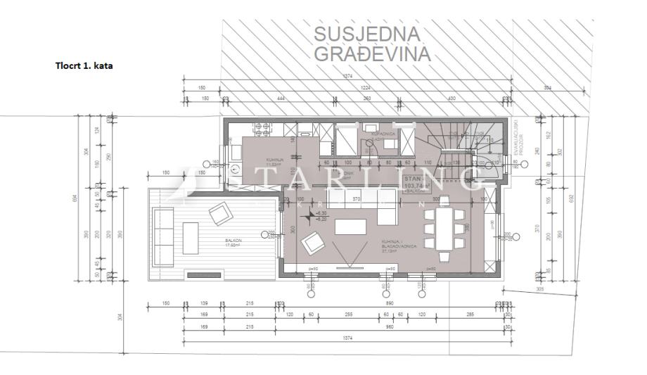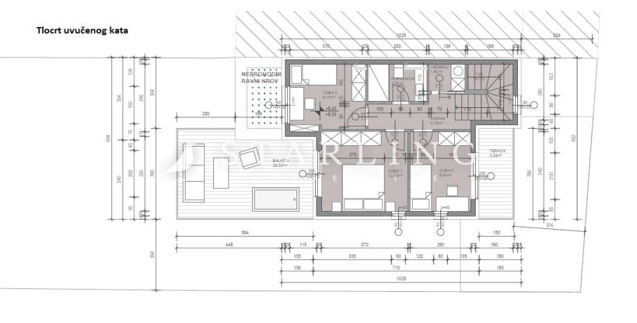 Prodaje se dvoetažni četverosoban stan površine 117,80 m2 na drugom katu. Stan se sastoji od ulaznog prostora, dnevnog boravka s kuhinjom i blagovaonicom, tri spavaće sobe, 2 kupaonice s wc-om, vešeraja, terase te 2 balkona.