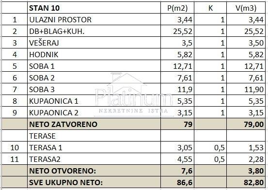 Nalazi se na drugom katu zgrade u izgradnji, a sastoji se od hodnika, kuhinje, blagovaonice i dnevnog boravka, 3 spavaće sobe, 2 kupaonice i vešeraja. Stanu pripadaju i 2 terase sa pogledom na more.