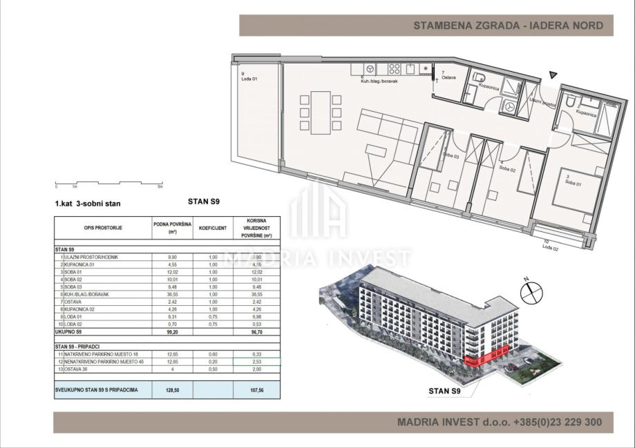 Stan S9 nalazi se na 1. katu, pripada mu vanjsko parking mjesto, natkriveno parking mjesto i ostava.