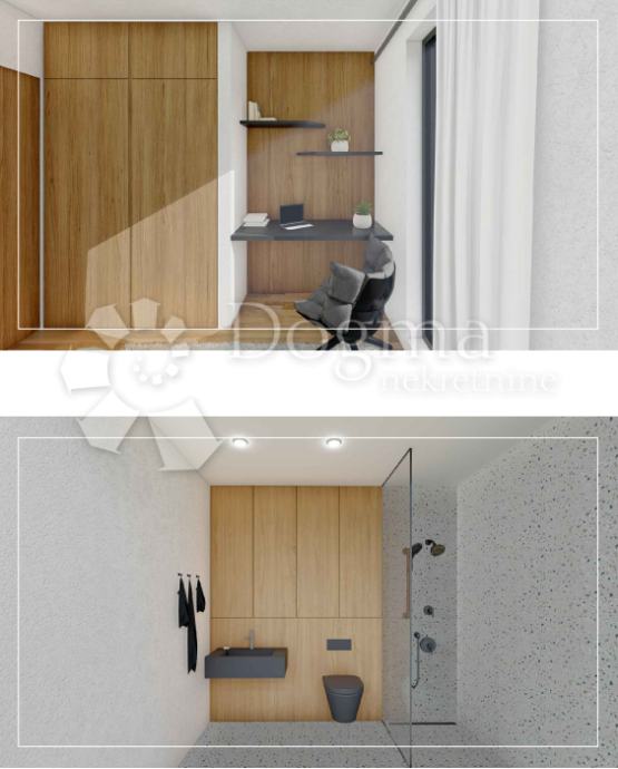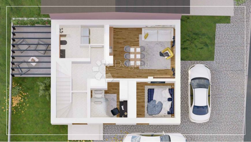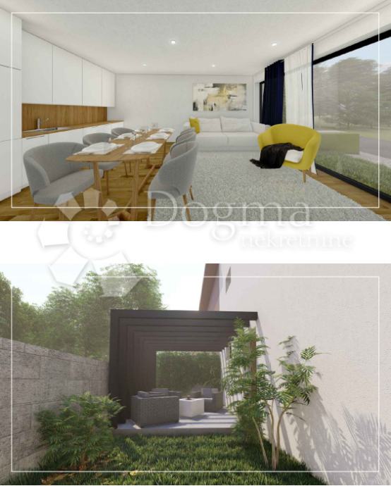 Sastoji se od 2 spavaće sobe, otvorenog prostora koji obuhvaća dnevni boravak, kuhinju i blagovaonicu, hodnika, izbe s priključkom za perilicu i dizalicom topline, te moderne kupaonice. Dodatno, uživat ćete u privatnom dijelu dvorišta zaklonjenog od pogleda te velikoj natkrivenoj terasi, idealnoj za opuštanje i druženje na otvorenom.