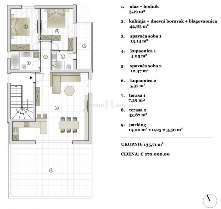 Stanu pripada i vanjsko parkirno mjesto od 14 m2. Moguće je kupiti dodatno parkirno mjesto.