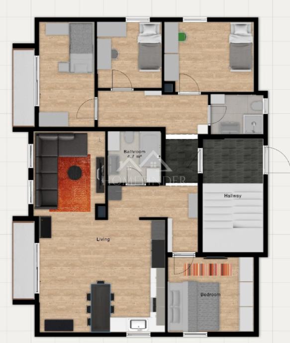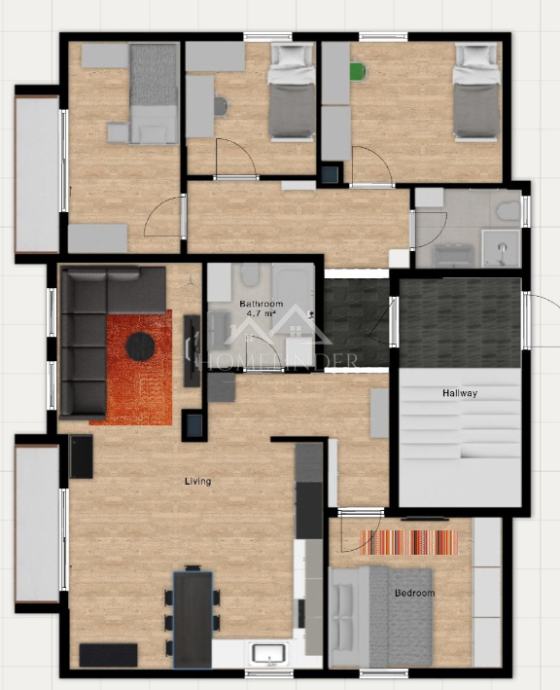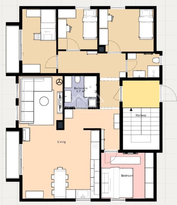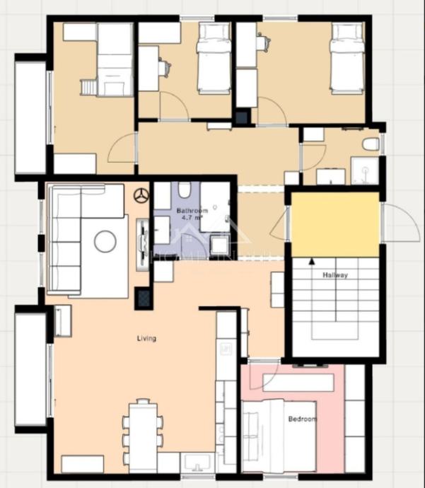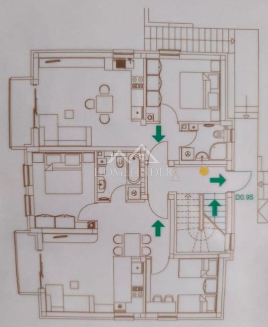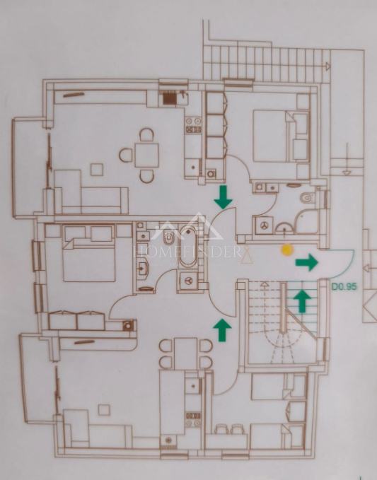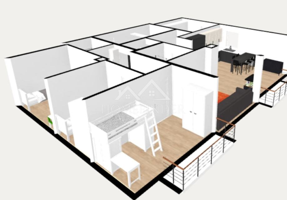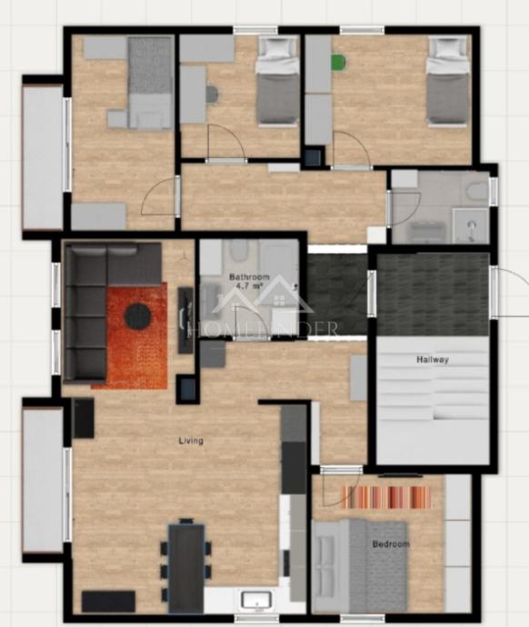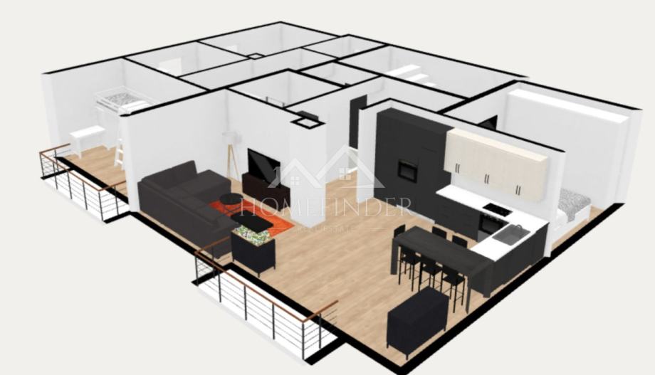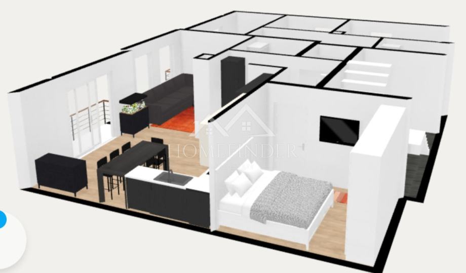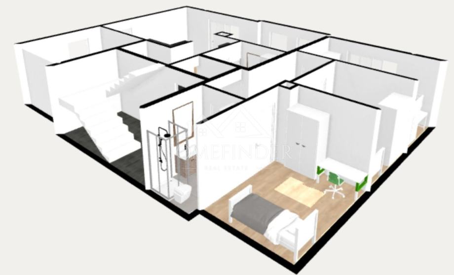 Stan se nalazi na visokom prizemlju i odlikuje se iznimno funkcionalnim rasporedom: 4 spavaće sobe, 2 kupaonice s WC-om, kuhinja s blagovaonicom te prostrani dnevni boravak. Južna orijentacija osigurava obilnu količinu prirodnog svjetla tijekom cijelog dana. Stan se prodaje potpuno namješten i spreman za trenutno useljenje — bez dodatnih ulaganja.
