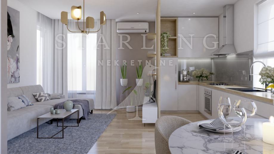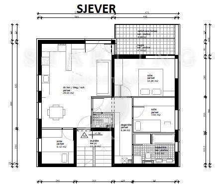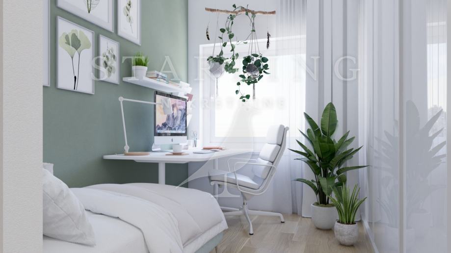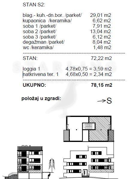 Stan se sastoji od dnevnog boravka s kuhinjom i blagovaonicom, tri spavaće sobe (8 m2, 13 m2 i 6 m2), kupaonice, wc-a, degažmana, natkrivene terase, loggie sveukupne neto korisne površine 78 m2.