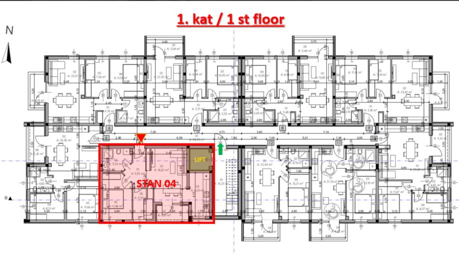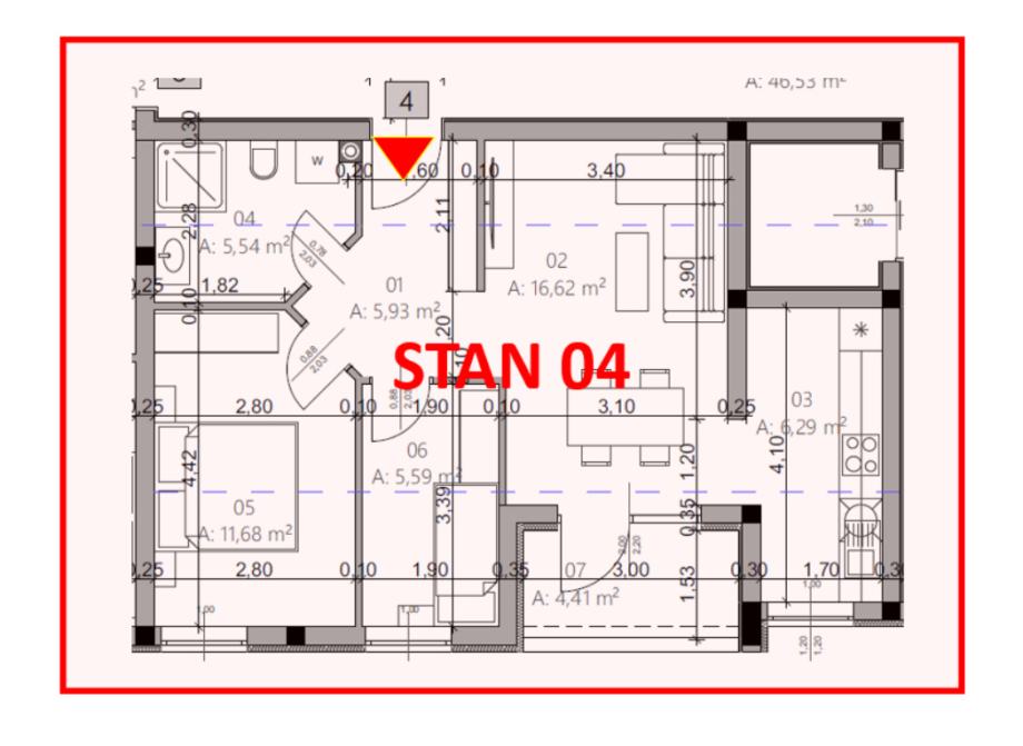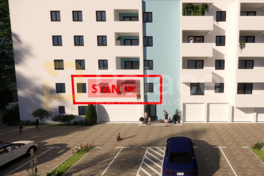 Stan se nalazi na 1. katu zgrade te se odlikuje dobro organiziranim rasporedom prostora. Ulazni hodnik vodi prema dnevnom dijelu otvorenog koncepta u kojem su kuhinja, blagovaonica i dnevni boravak povezani u skladnu cjelinu, stvarajući prozračan i svijetao ambijent. Iz boravka se pristupa balkonu koji pruža dodatni vanjski prostor za opuštanje. Stan je južne orijentacije šta omogućuje obilje svjetlosti tijekom cijelog dana.