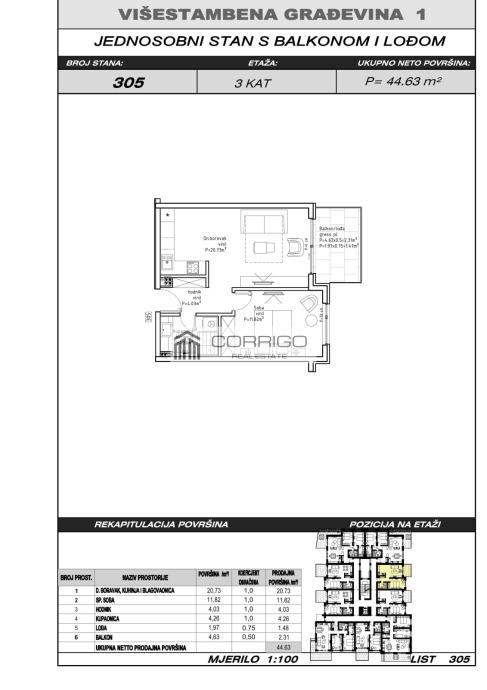 Na prodaju je atraktivan jednosoban stan površine 44,63 m², smješten na trećem katu moderne stambene zgrade s liftom. Stan se sastoji od dnevnog boravka s kuhinjom i blagovaonicom, spavaće sobe, hodnika, kupaonice, natkrivene lođe s izlazom iz dnevne zone. Stan ima iznimno funkcionalan raspored, dobru prirodnu osvijetljenost i povezanost unutarnjeg i vanjskog prostora.