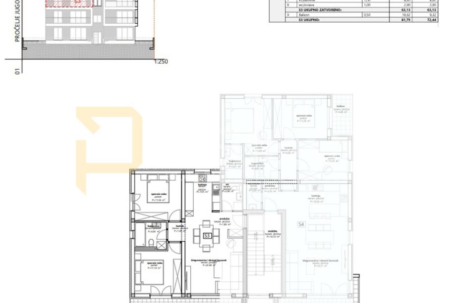 Sastoji se od: dvije spavaće sobe, wc-a, kupaonice, kuhinje s blagovaonicom, dnevnog boravka, kupaonice i balkona