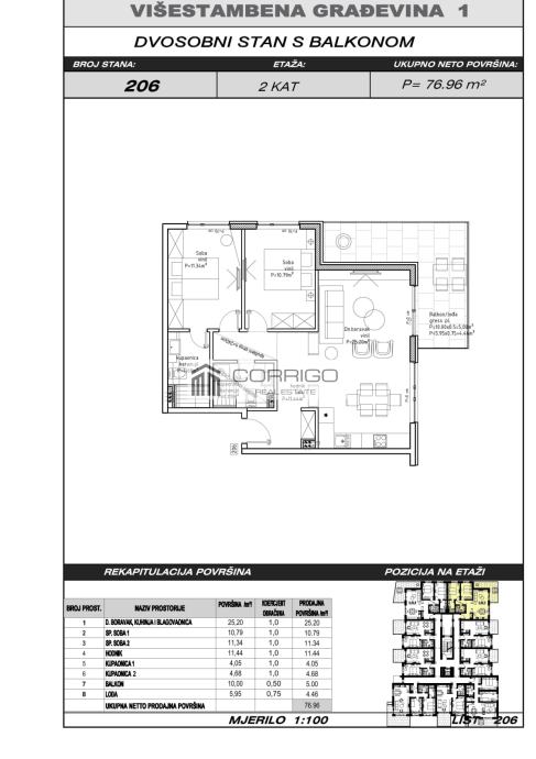 U prodaji je prostran i odlično raspoređen dvosoban stan površine 76,96 m², smješten na drugom katu moderne stambene zgrade u izgradnji. Stan se sastoji od dnevnog boravka s kuhinjom i blagovaonicom, dvije spavaće sobe, dvije kupaonice, hodnika, balkona. Prostor je svijetao, otvoren i ugodan, s izlazom na natkriveni vanjski dio.
