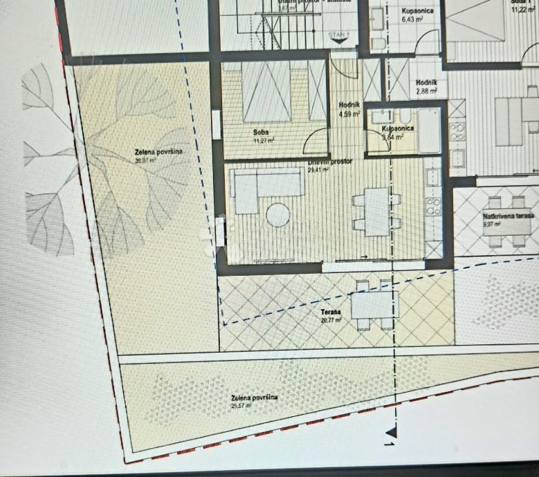 Stan se sastoji od dnevnog boravka sa kuhinjom, spavaće sobe, kupaonice, hodnika i terase veličine 20 m2.