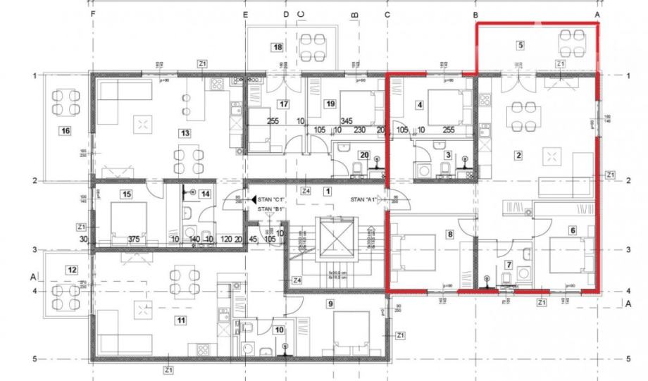 Stan se sastoji od ulaznog hodnika, kuhinje, blagovaonice, dnevnog boravka, dvije kupaonice, tri spavaće sobe i natkrivene terase, a ukupna netto površina stana iznosi 83,40 m2.