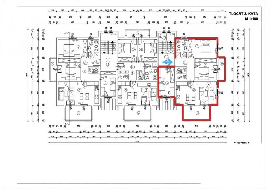 Stan se nalazi na trećem katu, ima neto površinu od 85 m2, a sastoji se od 3 spavaće sobe, od kojih jedna ima izlaz na svoju terasu, kuhinje, blagovaone i dnevnog boravka iz kojeg se izlazi na veliku terasu sa prekrasnim pogledom na more. Stan ima jednu veliku kupaonu i odvojeni wc.