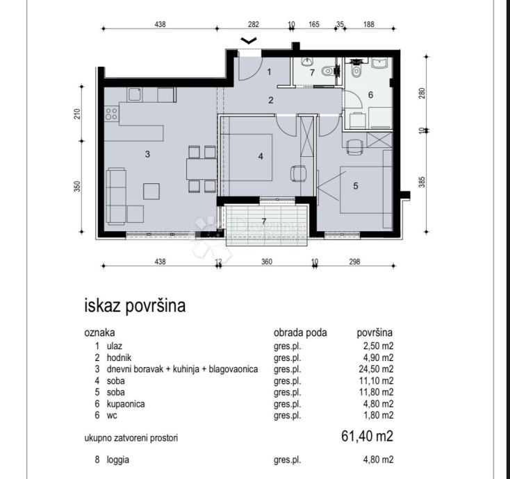 sobe, kupaonice i wc-a. Neto površina zatvorenog dijela stana je 54,40m2.