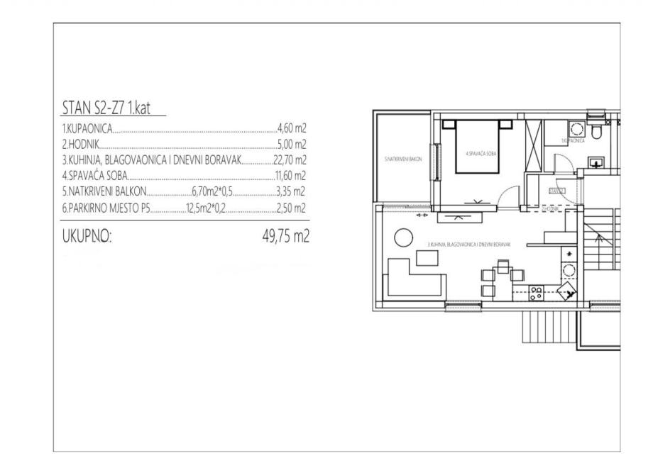 Smješten je na prvom katu zgrade te se sastoji od ulaznog hodnika, kupaonice, jedne spavaće sobe i kuhinje s blagovaonicom i dnevnim boravkom iz kojeg se izlazi na natkrivenu terasu. Stambena površina stana iznosi 43,9 m2, terasa ima 6,70 m2, dok ukupna neto površina iznosi 49,75 m2. Stanu pripada jedno parkirno mjesto koje je uključeno u cijenu.