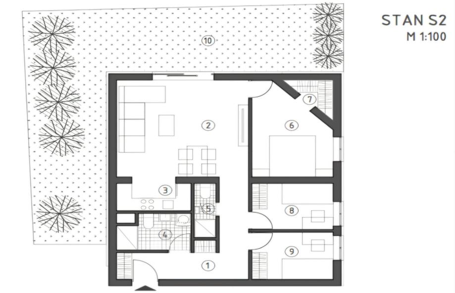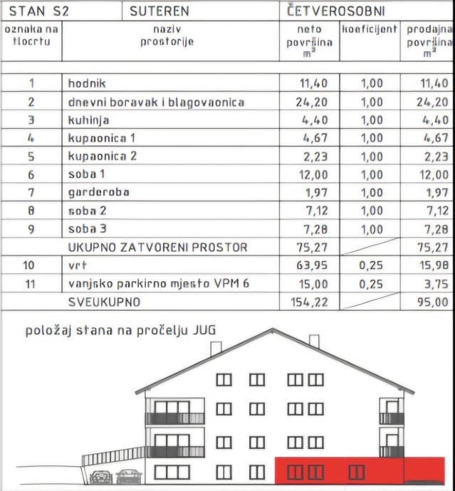 Stan se nalazi u prizemlju zgrade i raspolaže s ukupnom neto prodajnom površinom od 93,25 m².
