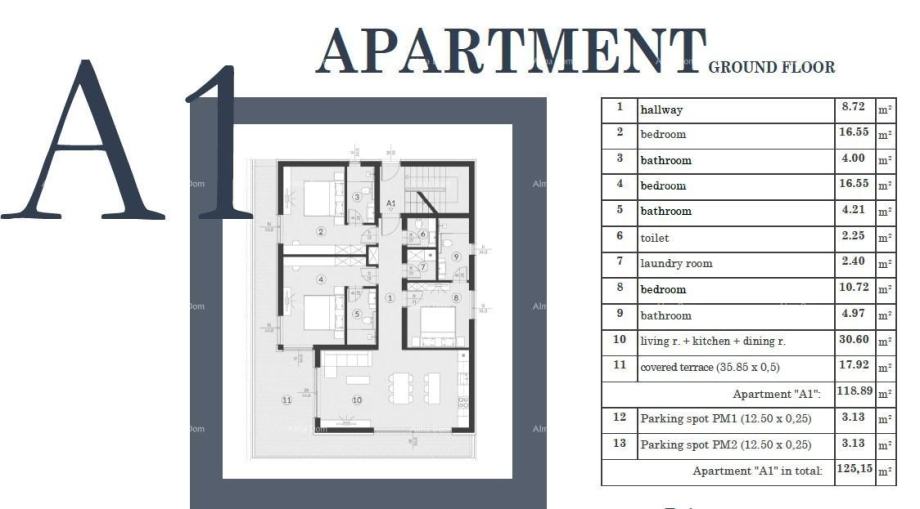 Stan oznake A1 nalazi se u prizemlju zgrade A i sastoji se od: hodnika, dnevnog boravka s kuhinjom i blagovaonom, 3 spavaće sobe, 3 kupaone, WC-a i terase.