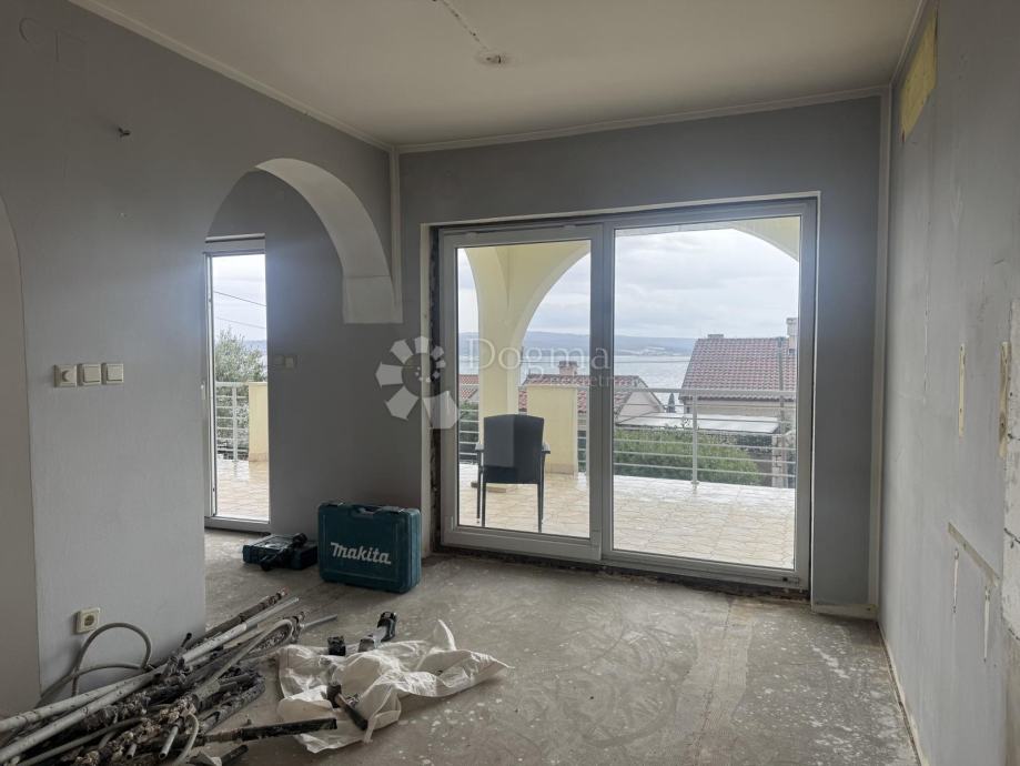 Iz dnevnog boravka i kuhinje pruža se lijep pogled na more, a prostor ima direktan izlaz na terasu, idealnu za opuštanje i uživanje u mediteranskom ambijentu.
