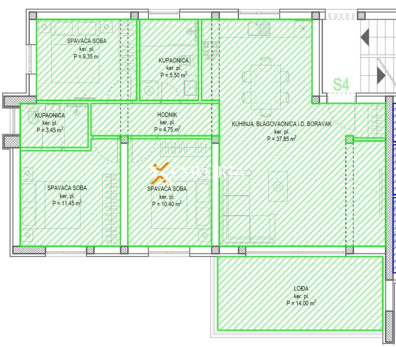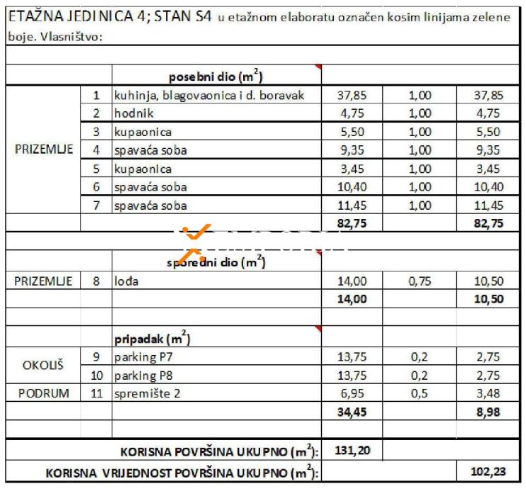 Stan se sastoji od hodnika, dvije spavaće sobe, treće spavaće sobe s vlastitom kupaonicom, dodatne kupaonice, kuhinje s blagovaonicom i dnevnim boravkom te lođe. Uz stan dolaze i dva parkirna mjesta te spremište površine 6,95 m² (3,48 m² neto) koje se nalazi u podrumu zgrade.OpremaStan ima podno električno grijanje u svim prostorijama osim u spavaćim sobama, a klimatiziran je s ukupno četiri klima jedinice – po jedna u svakoj sobi i dnevnom boravku. PVC stolarija s troslojnim staklom, električnim žaluzinama i komarnicima osigurava visoku razinu udobnosti. Podovi su obloženi pločicama, dok su u spavaćim sobama postavljeni parketi. Zgrada je građena ciglenim termo blokom i betonskim zidovima, fasada je izolirana stiroporom debljine 12 cm, a objekt je priključen na kanalizaciju. Ulazna vrata su protuprovalna i protupožarna, a zgrada ima novi, ravni betonski krov.
