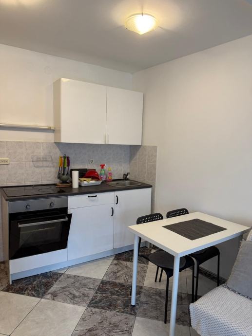 Iznajmljuje se garsonijera od 37 m² u stambenoj zgradi iz 2000. godine, zadnji put renovirana 2022. Prostor je jednoetažan i organiziran kao otvoreni tlocrt - kuhinjski dio s ugradbenim elementima, pećnicom i hladnjakom prelazi u dnevni boravak s kutnom garniturom i bračnim krevetom. Namještaj je uključen, stan je spreman za useljenje.