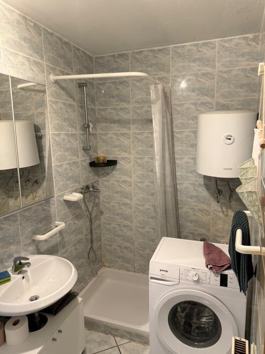Kupaonica ima tuš kabinu, umivaonik i perilicu rublja, a bojler je vidljiv na zidu. Pločice su svijetlosive, prostor je kompaktan ali funkcionalno raspoređen. Režije su uključene u cijenu najma.