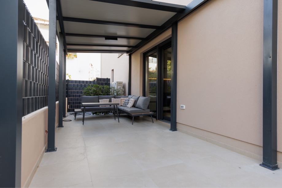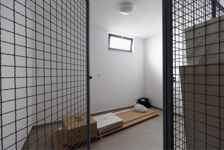Sastoji se od: kuhinje i blagovaone, dnevnog boravka, hodnika sa velikim ugradbenim ormarima, kupaonice s wc-om, spavaće sobe i ogromne terase (cca 20m2) sa pergolom i vrtnom garniturom. Stanu također pripadaju 2 parkirna mjesta i spremište od cca 8m2 do kojeg vodi lift.