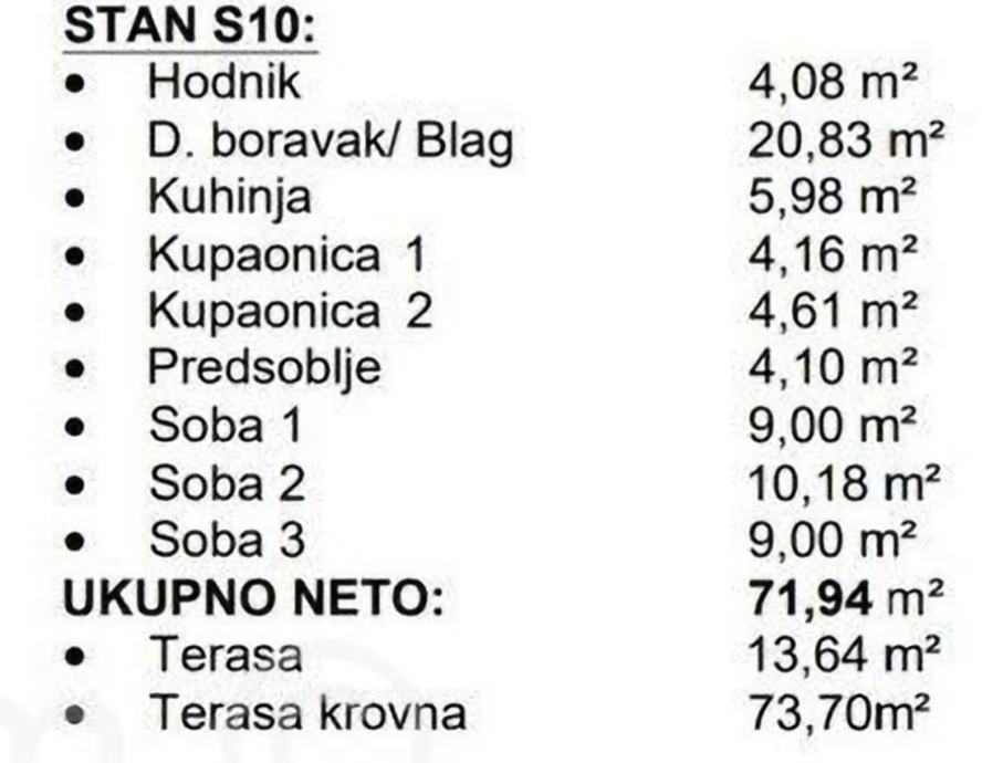 Ukupna kvadratura stana sa unutarnjom stambenom površinom , terasama i krovnon terasom iznosi 160m2 + parking mjesto 15m2.