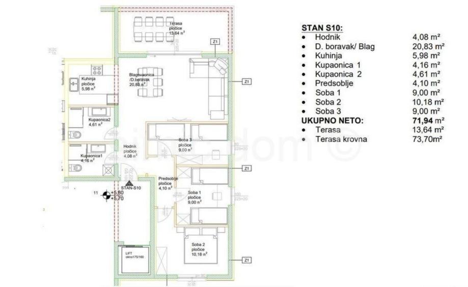 Stan ima površinu od 72 m² i sastoji se od predsoblja, hodnika, kuhinje, blagovaonice i dnevnog boravka s izlazom na terasu od 13,64 m² te tri spavaće sobe i dvije kupaonice. Stanu pripada i nenatkrivena krovna terasa korisne površine 73,70 m² s predivnim panoramskim pogledom na more te pripremom za jacuzi, ljetnu kuhinju i pergolu. U izgradnji su se koristili materijali visoke kvalitete( AB konstrukcija, rofix,geberit marazzi aluminij stolarija) a grijanje i hlađenje se odvija putem 4 klima uređaja. Stanu pripadaju dva vanjska parking mjesta.