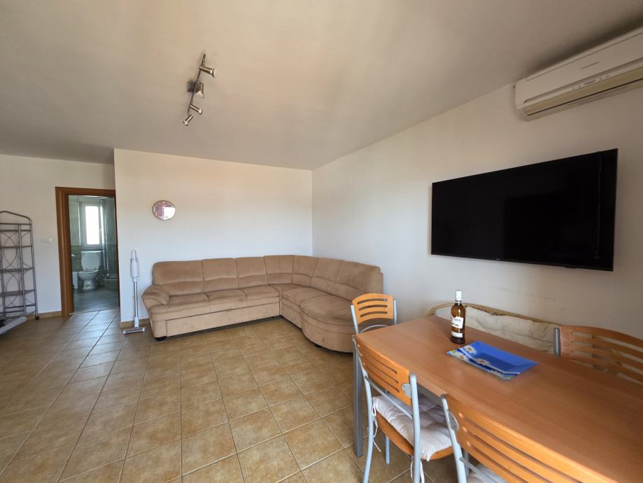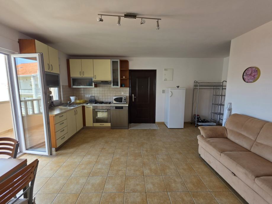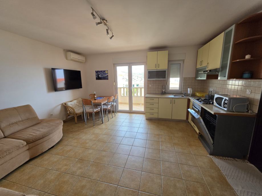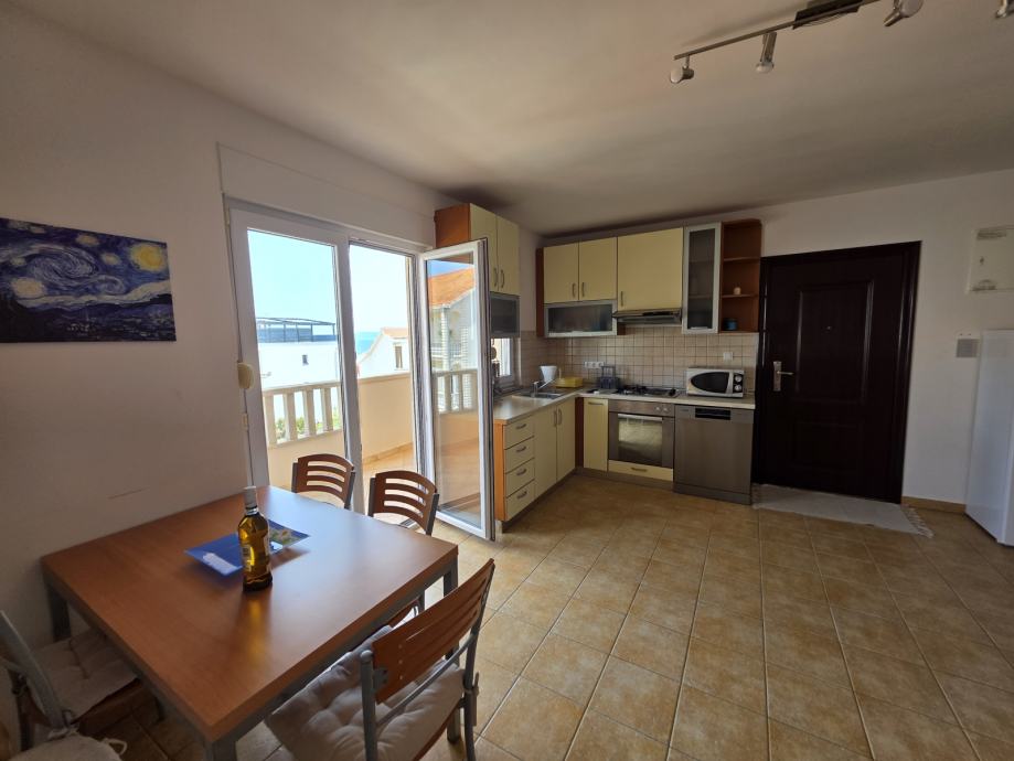 Stan se sastoji od dnevnog boravka, kuhinje i blagovaonice, hodnika, spavaće sobe, kupaonice i natkrivene terase s pogledom na more.