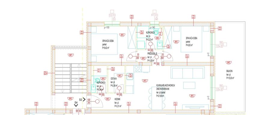 - Kuhinju s blagovaonicom i dnevnim boravkom (22 m²),