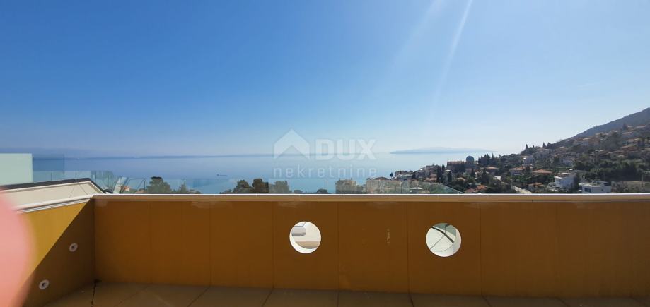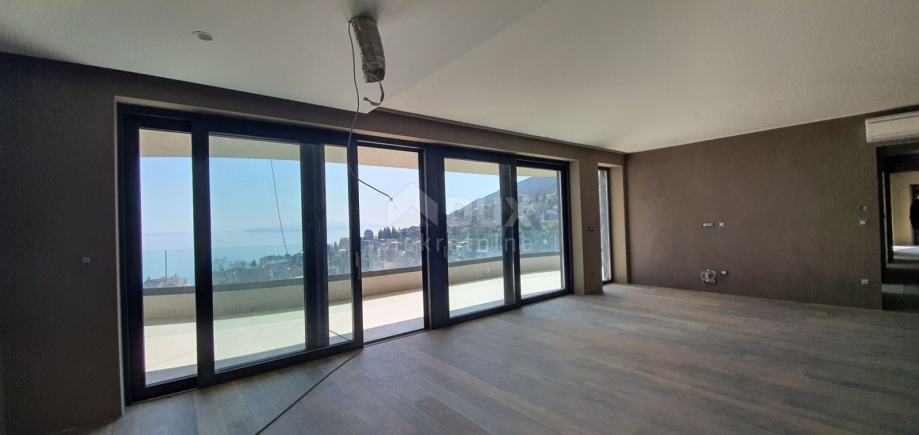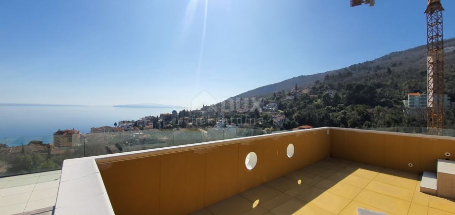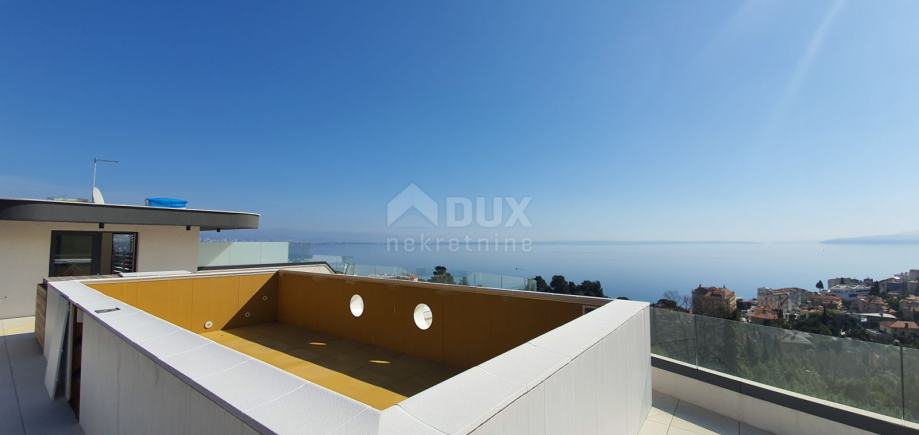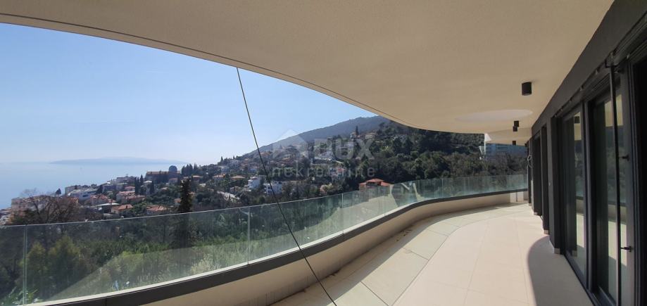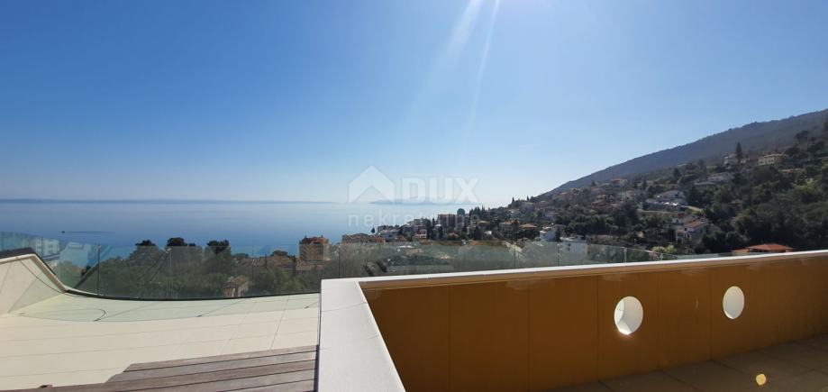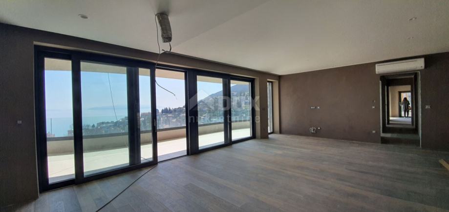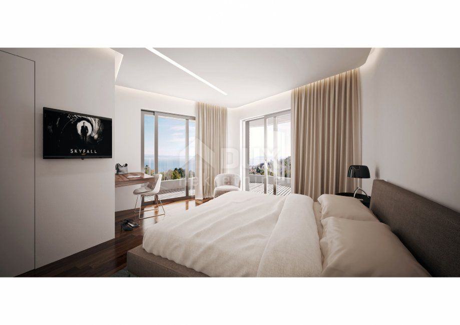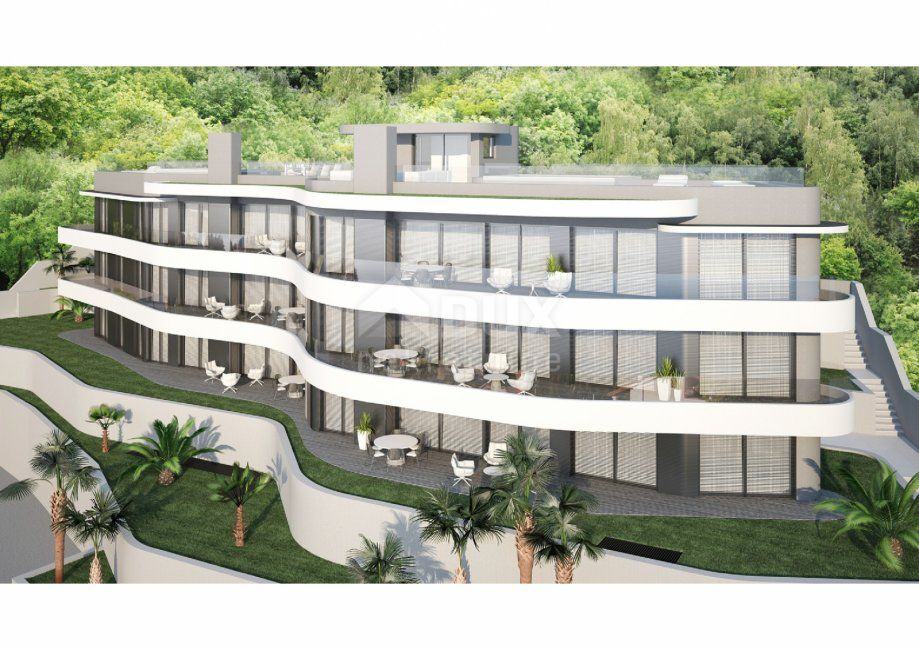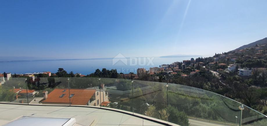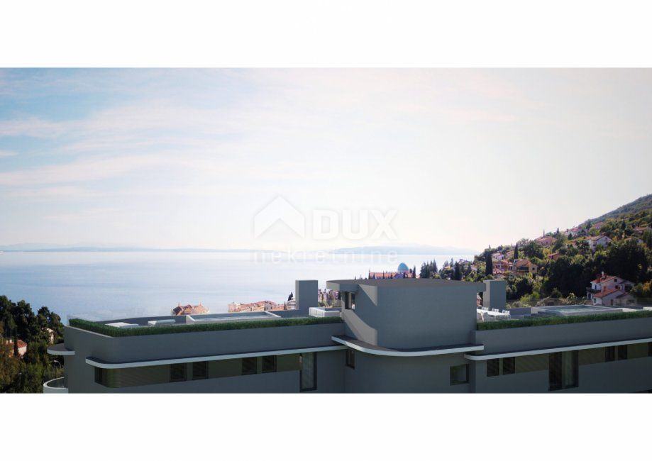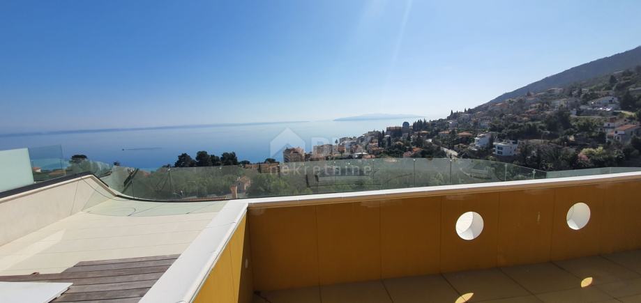 Novogradnja nedaleko centra Opatije, vrhunska gradnja stanova prekrasne arhitekture sjedinjene sa mediteranskim okruženjem i zavidnim pogledom na more. Podijeljena je na dva suterena od kojih je jedan garaža za stanare, a drugi podijeljena na velika spremišta, zatim prizemlje i dva kata spojenih liftom. Svakome stanu pripada jedno prostrano spremište te po tri parking mjesta u garaži.Kvalitetna gradnja ovih stanova te neponovljivi dizajn okoliša i samog stambenog prostora, imperativ je za kupce koji imaju zavidan buđet i jedinstven životni stil. Ovaj prekrasan i prostran trosoban stan sa dnevnim dijelom od ukupno 215m², se nalazi na drugome katu, južne, sjeverne i istočne orijentacije sa prekrasnom terasom, krovnom terasom od 53.91 m² s bazenom od 24 m² sa kojih se pruža panoramski pogled na Kvarner. Stan se sastoji od komotnog dnevnog boravka sa blagavaonom i kuhinjom te tri spavaće sobe sa tri kupaonice.