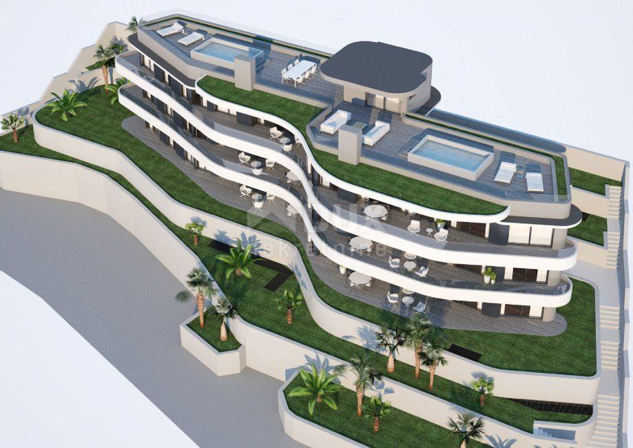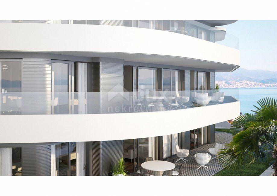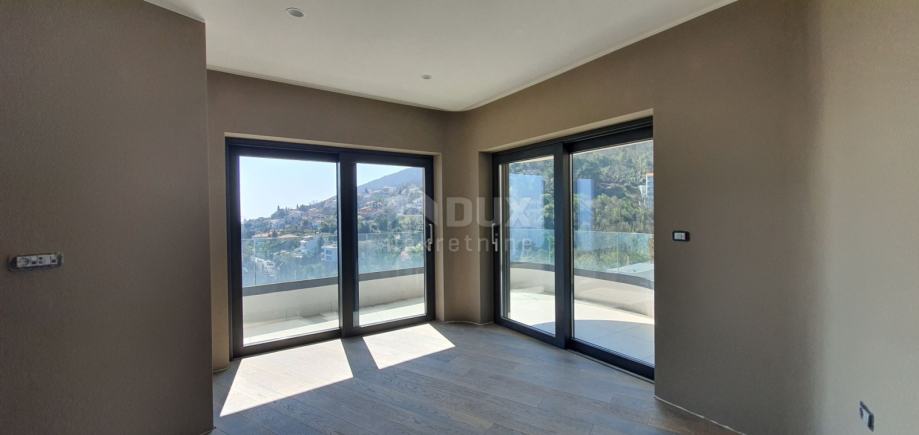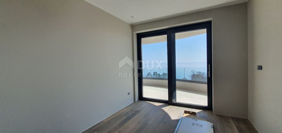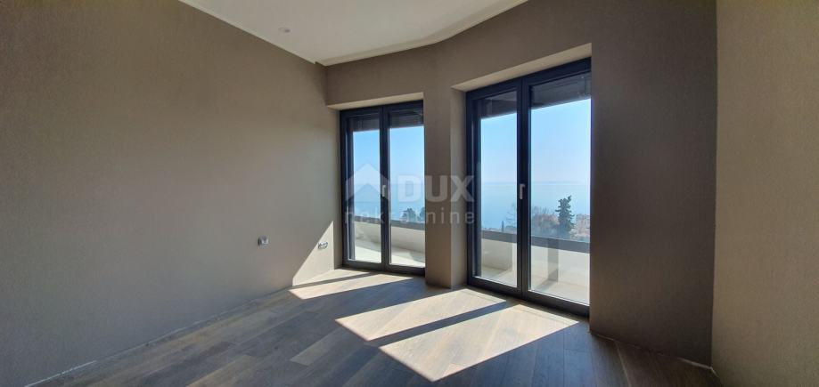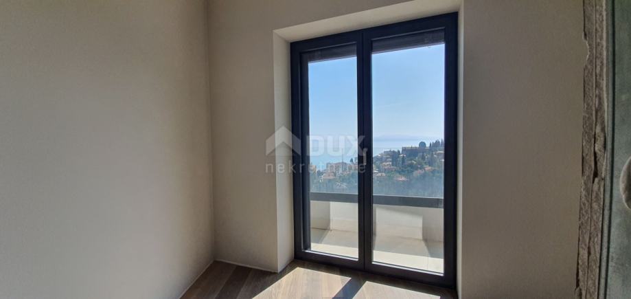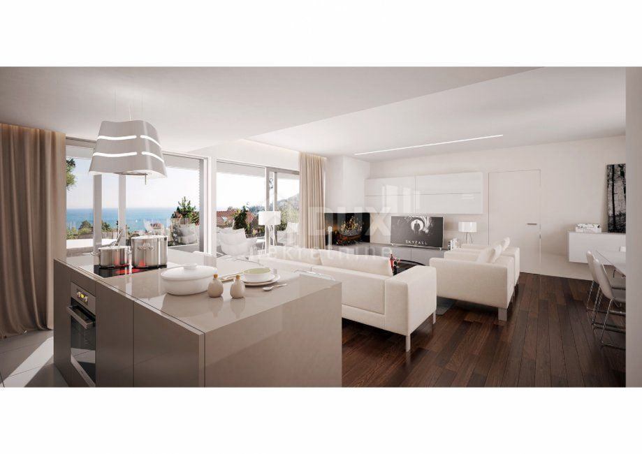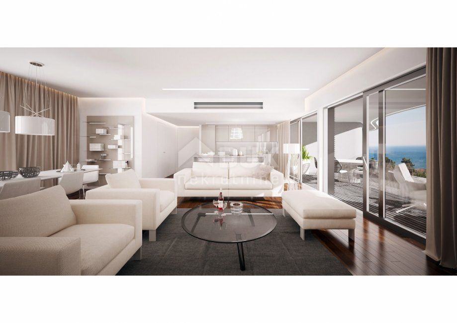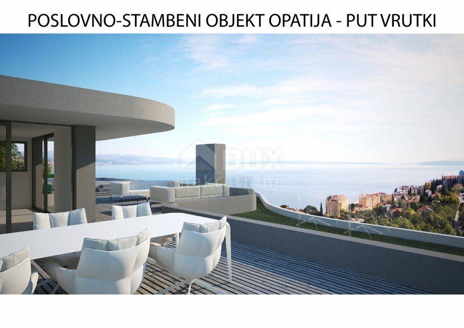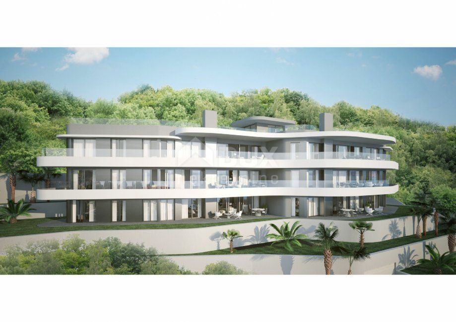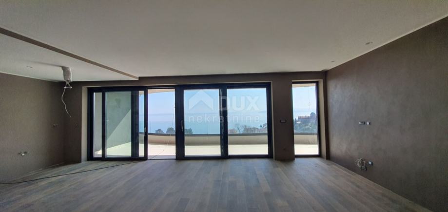 Novogradnja nedaleko centra Opatije, vrhunska gradnja stanova prekrasne arhitekture sjedinjene sa mediteranskim okruženjem i zavidnim pogledom na more. Podijeljena je na dva suterena od kojih je jedan garaža za stanare, a drugi podijeljena na velika spremišta, zatim prizemlje i dva kata spojenih liftom. Svakome stanu pripada jedno prostrano spremište te po tri parking mjesta u garaži.Kvalitetna gradnja ovih stanova te neponovljivi dizajn okoliša i samog stambenog prostora, imperativ je za kupce koji imaju zavidan buđet i jedinstven životni stil. Ovaj prekrasan i prostran trosoban stan sa dnevnim dijelom od ukupno 215m², se nalazi na drugome katu, južne, sjeverne i istočne orijentacije sa prekrasnom terasom, krovnom terasom od 53.91 m² s bazenom od 24 m² sa kojih se pruža panoramski pogled na Kvarner. Stan se sastoji od komotnog dnevnog boravka sa blagavaonom i kuhinjom te tri spavaće sobe sa tri kupaonice.