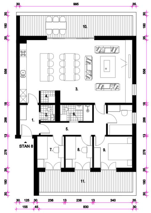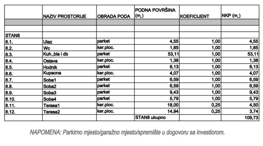 Sastoji se od: ulaza, hodnika, kuhinje, blagavaone i dnevnog boravka, ostave, wc-a, kupaone, 4 sobe i 2 terase ukupne neto korisne površine 109,73 m2