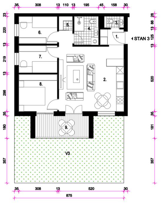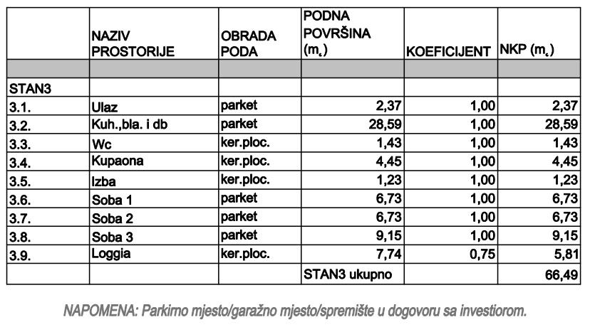 Sastoji se od: ulaza, kuhinje, blagavaone i dnevnog boravka, izbe, wc-a, kupaone, 3 sobe i loggie ukupne neto korisne površine 66,49 m2