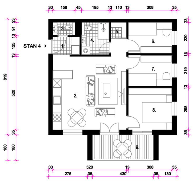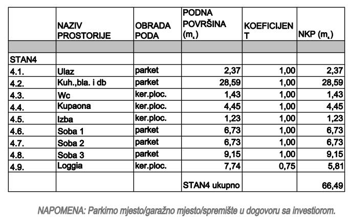 Sastoji se od: ulaza, kuhinje, blagavaone i dnevnog boravka, izbe, wc-a, kupaone, 3 sobe i loggie ukupne neto korisne površine 66,49 m2