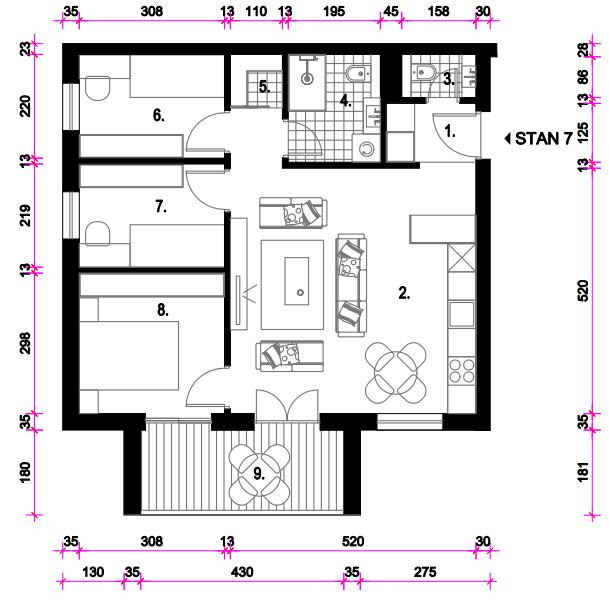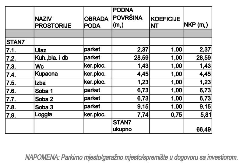 Sastoji se od: ulaza, kuhinje, blagavaone i dnevnog boravka, izbe, wc-a, kupaone, 3 sobe i loggie ukupne neto korisne površine 66,49 m2