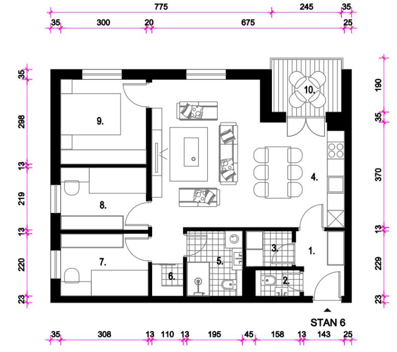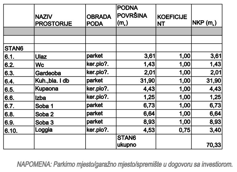 Sastoji se od: ulaza, kuhinje, blagavaone i dnevnog boravka, izbe, wc-a, kupaone, garderobe, 3 sobe i loggie ukupne neto korisne površine 70,33 m2