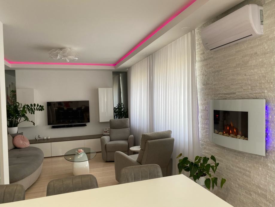 Dnevna soba ima dvije fotelje s relax funkcijom, kamin na struju s pozadinskim svjetlom (na daljinski) na zidu od bijelog sjajnog kamena, led rasvjete u bojama iznad dnevne sobe (na daljinski), veliki ovalni trosjed, veliki televizor.