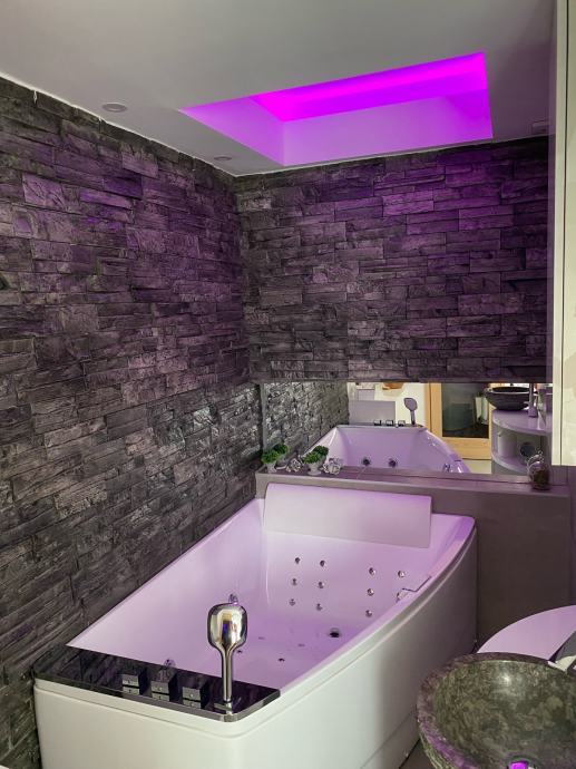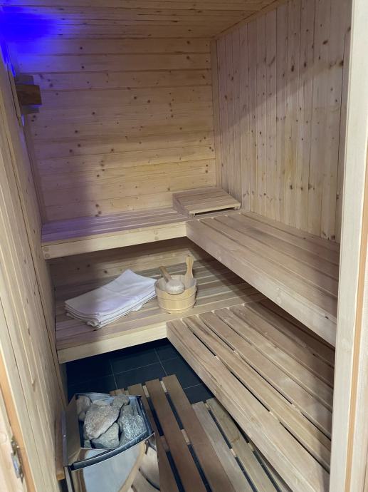Wellness soba sadrži krevet (160x200), led svjetlo na stropu u bojama iznad kreveta, zvjezdano nebo u bojama iznad kreveta (na daljinski), finsku saunu za 4 osobe (svjetlo u bojama na daljinski, posuda za vodu, termometar, podložak za glavu), jacuzzi (hidromasažnu kadu za 2 osobe, vodene i zračne mlaznice, svjetlo u bojama), stol za masažu, led svjetlo u bojama iznad jacuzzija (na daljinski), ogledalo, kameni umivaonik, veliku ostavu iznad saune, ručnike za saunu. Zid oko jacuzzija je obložen kamenom.