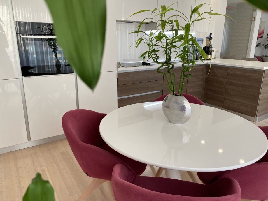 Kuhinja ima pult/šank s 3 barske stolice i rasvjetom ispod, ugradbenu perilicu, hladnjak i pećnicu, poseban filter za vodu ugrađen ispod sudopera, stol s 4 stolice na okretanje (Modul) i perivim materijalom, iznad stola je dizajnerksi luster i led svjetlo u bojama (na daljinski). Pored kuhinje je veća ostava. Staklenim vratim odvojen je dnevni dio stana. Stan ima i dva balkona.
