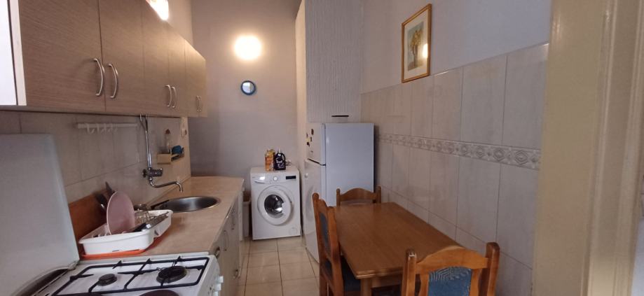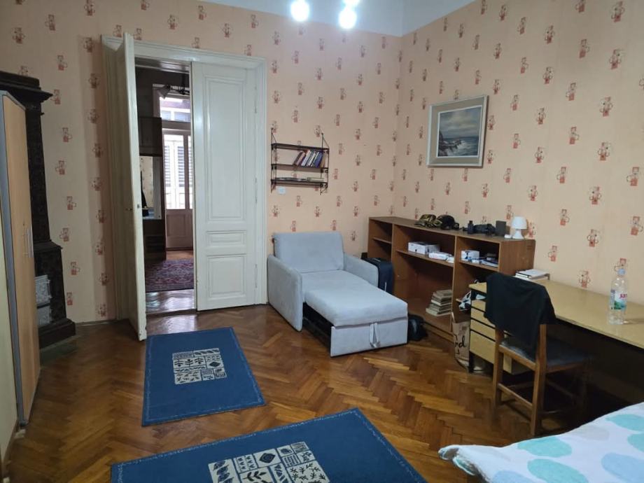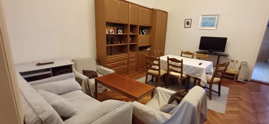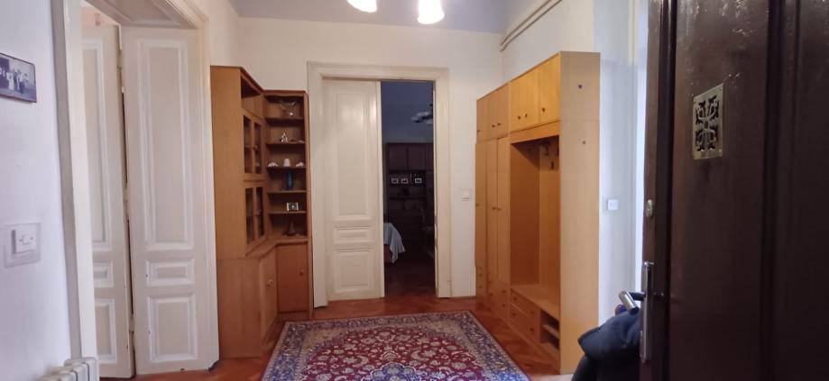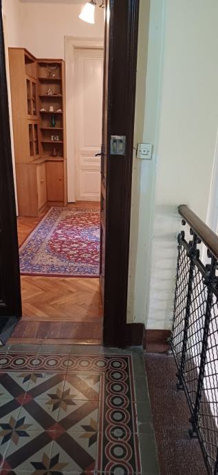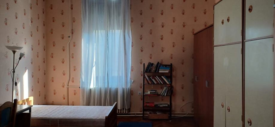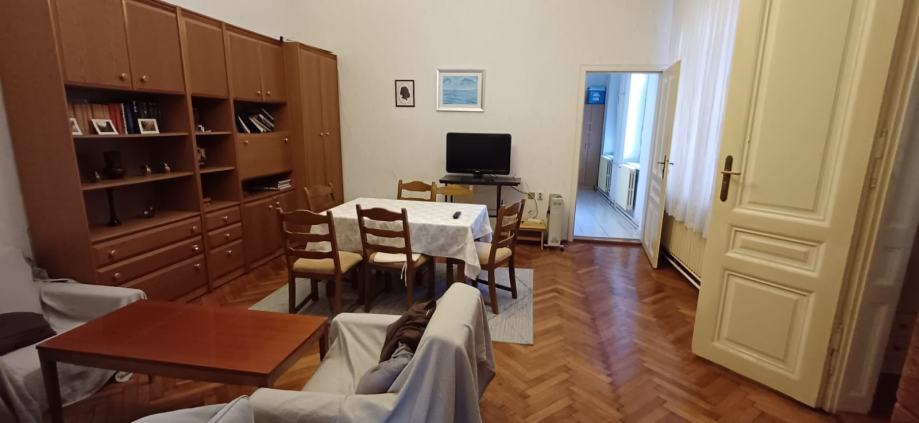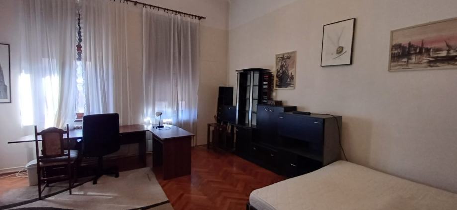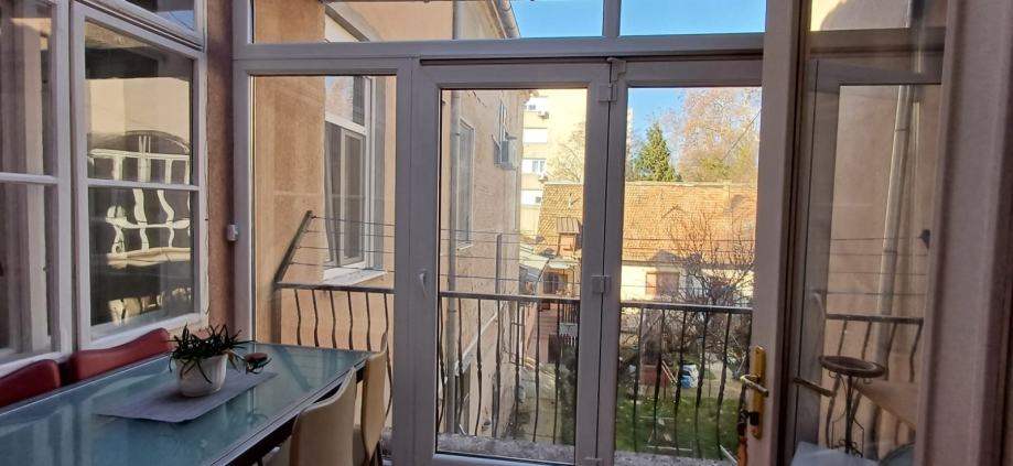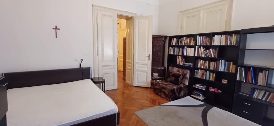Komforan potpuno namješten stan sa zimskim vrtom (lođom) od 108 m2 u secesijskoj zgradi na 1. katu. Iz prvog hodnika ulazi se u tri prostrane sobe (boravak i dvije spavače/radne sobe), a 2 kupatila, kuhinja i ostava su u posebnom dijelu stana (odvojeni drugim hodnikom). Uz stan ide i podrum. Stan je u centru grada blizu tri velika fakulteta: Filozofskog, Pravnog i Ekonomskog. Stan je miran (samo 2 stana na katu), a blizu svih važnih ustanova u centru grada (blizu hotela Osijek, glavnih trgova u centru, tržnice, katedrale, HNK i dr.). U stanu može živjeti više osoba.
