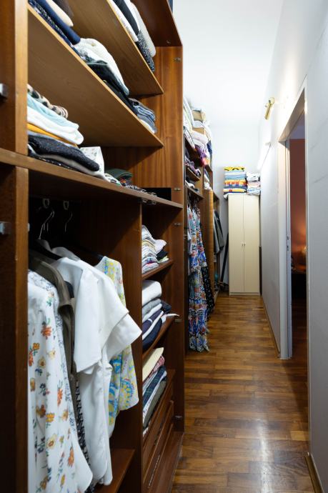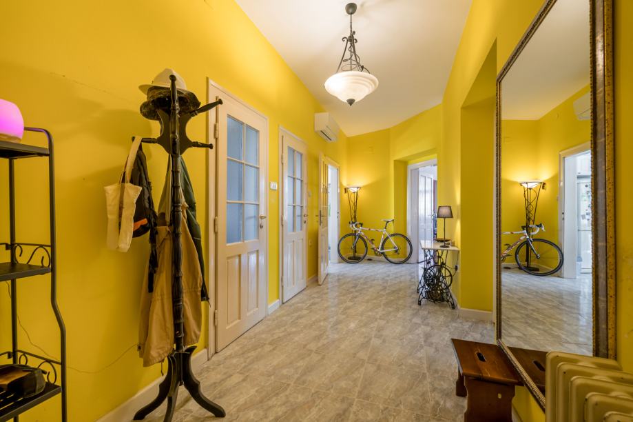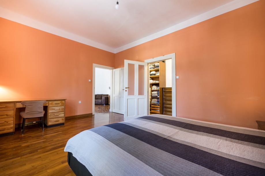 Stan je vrlo prostran, s puno prirodnog svjetla (orijentacija sjever, istok i zapad), s visokim stropovima i pravim parketima. Ima praktičan raspored koji se sastoji od hodnika, dvije spavaće sobe (od kojih jedna ima walk-in ormar), velikog dnevnog boravka, kuhinje, špajze (koja je nekada bila djevojačka soba), kupaonice s wc-om i dodatnog wc-a. U stan stane 53 ljudi, ako planirate proslavu (provjereno :D).