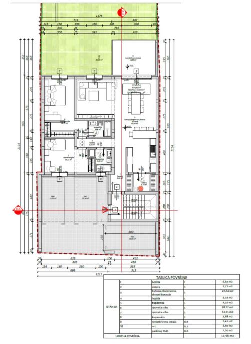 STAN U PRIZEMLJU – komforan trosoban stan s nenatkrivenom terasom od 15 m2 i vrtom površine 85 m2. Ukupna korisna površina stana iznosi: P=127,83 m2
