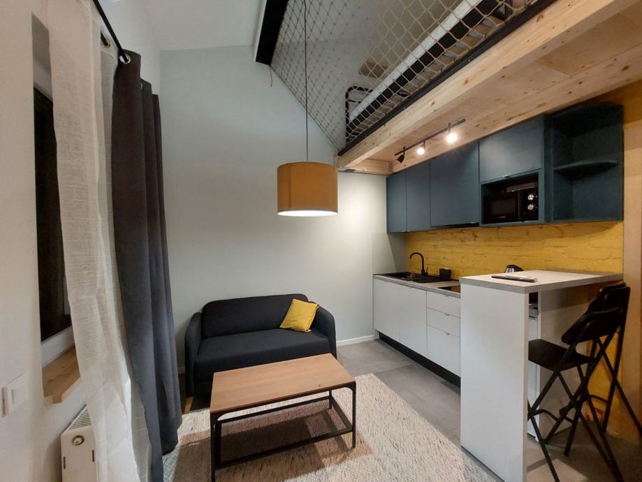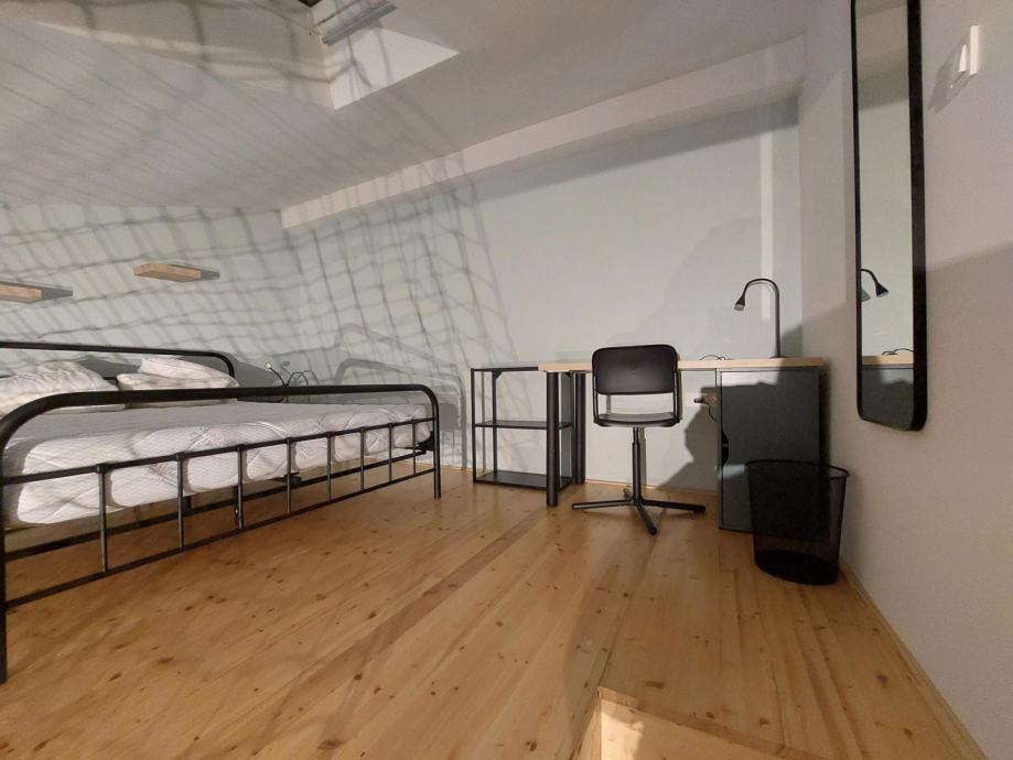 Iznajmljuje se novi stan, izgrađen 2024. godine. Površine 33 m2, koncept otvorenog prostora. Na donjoj etaži se nalaze dnevni boravak sa kuhinjom i kupaonica sa WC-om. Na gornjoj etaži je spavaća soba (krevet veličine 160*200 cm). Kuhinja opremljena indukcijskom pločom, mikrovalnom, perlicom posuđa, posuđem, manji hladnjak sa zamrzivačem. Grijanje etažno na plin. Stan ima klima uređaj, TV, dvosjed, ugradbeni ormari, walk-in tuš, komarnike. Zgrada ima zajedničku praonicu/sušionicu rublja (perilica/sušilica/glačalo s daskom) i zajedničko dvorište (dijele 7 stanova). Parking ispred objekta. Javni prijevoz udaljen 2 minute hoda, IT park 5 minuta. Namijenjeno za smještaj 1 osobe. Pušenje unutar stana nije dozvoljeno. Stan gleda na dvorište.